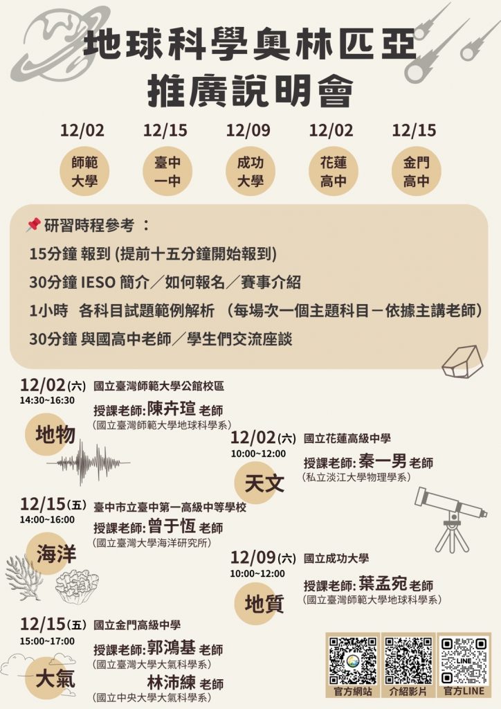 為推廣高級中等教育階段學生參與國際地球科學奧林匹亞競賽(International Earth Science Olympiad, 簡稱IESO)之意願,舉辦地球科學奧林匹亞競賽教師推廣與試題解析研習營。