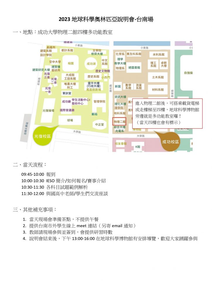 為推廣高級中等教育階段學生參與國際地球科學奧林匹亞競賽(International Earth Science Olympiad, 簡稱IESO)之意願,舉辦地球科學奧林匹亞競賽教師推廣與試題解析研習營。