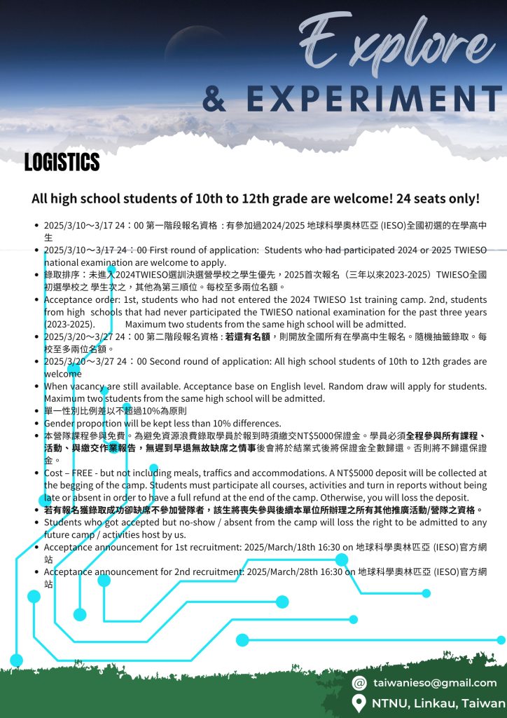 Acceptance order: 1st, students who had not entered the 2024 TWIESO election camp. 2nd, students from high schools that had never participated the TWIESO national examination for the past three years (2023-2025). Maximum two students from the same high school will be admitted.