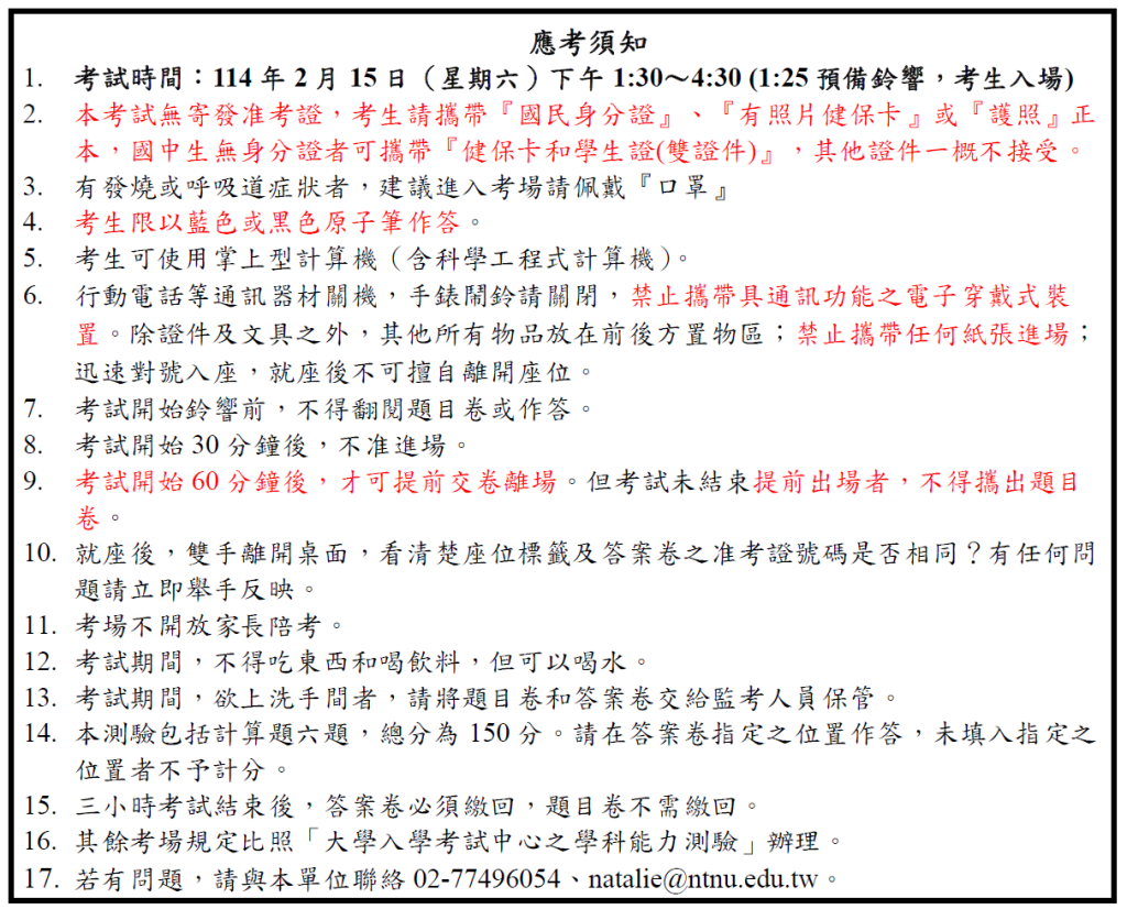 4) 考生資料如有錯誤,請以Email通知natalie@ntnu.edu.tw,信件內容需包含姓名識別碼(身分證字號的前2後3碼)和待修正資料