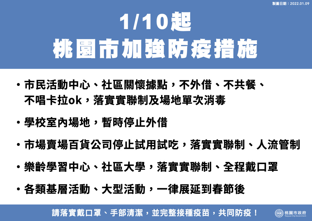 依111年1月10日桃園市政府公布之「桃園市加強防疫措施」(詳附件),1~2月份即將舉辦活動調整如下: