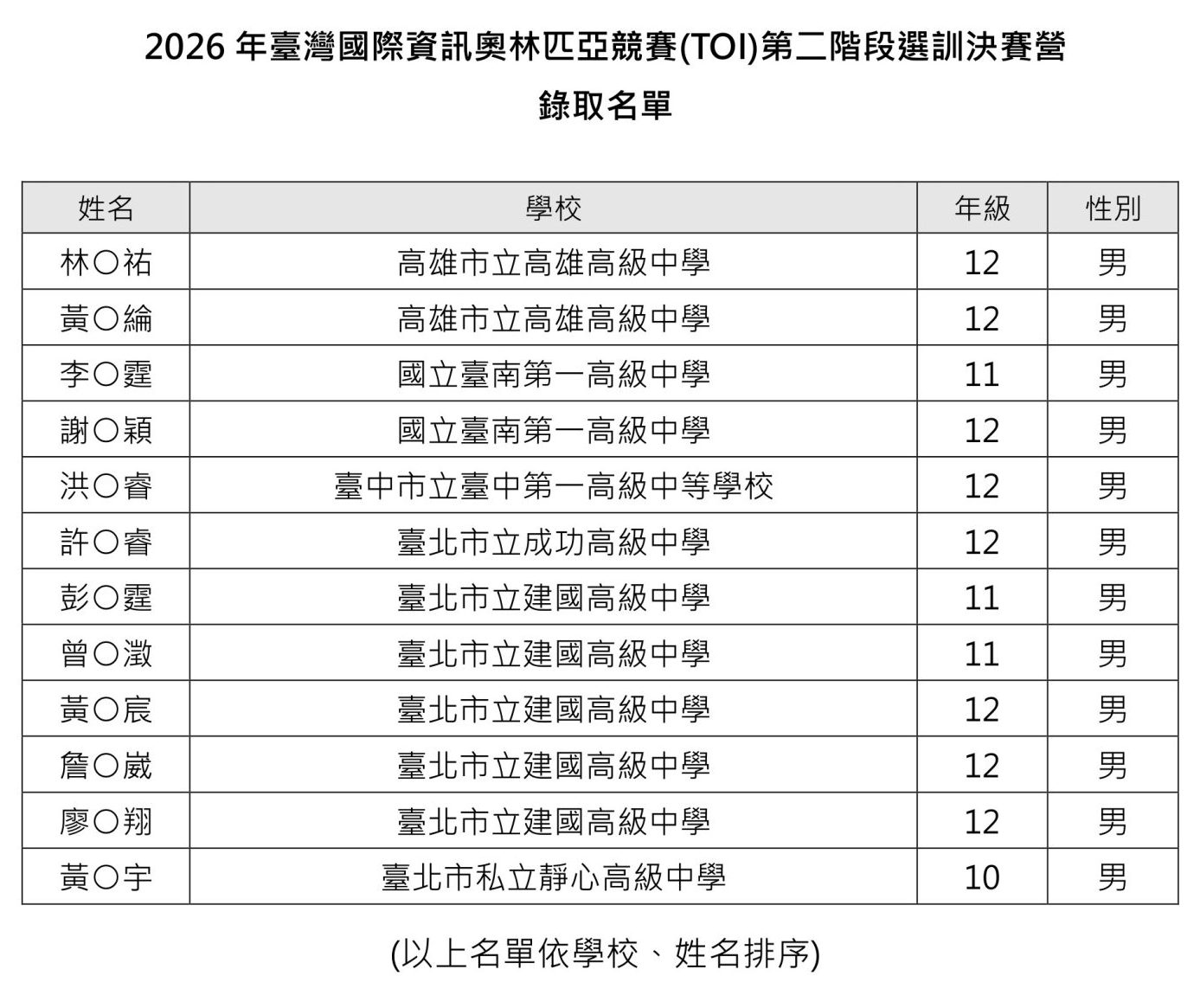 TOI 2026 第二階段選訓決賽營 錄取名單